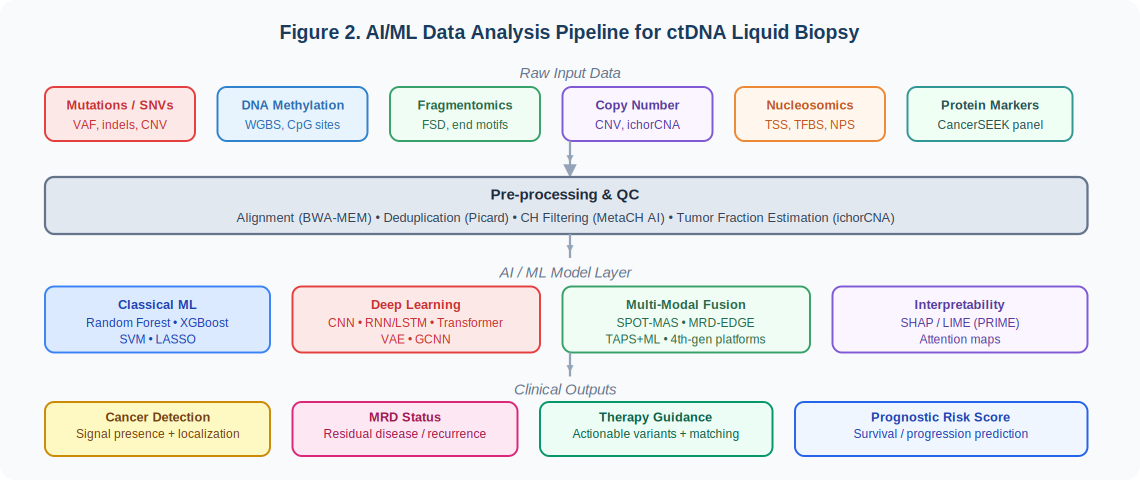 Figure 2. AI/ML Data Analysis Pipeline for ctDNA Liquid Biopsy. Raw multi-modal cfDNA inputs (mutations, methylation, fragmentomics, CNV, nucleosomics, protein markers) flow through QC pre-processing into a tiered ML model layer, yielding four categories of clinical output: cancer detection, MRD status, therapy guidance, and prognostic risk scoring.