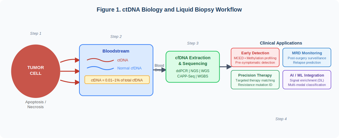 Figure 1. ctDNA Biology and Liquid Biopsy Workflow. Tumor cells shed ctDNA into the bloodstream through apoptosis and necrosis. Following cfDNA extraction and sequencing, ctDNA analysis enables four clinical application domains: early cancer detection, MRD monitoring, precision therapy guidance, and AI/ML-assisted interpretation.